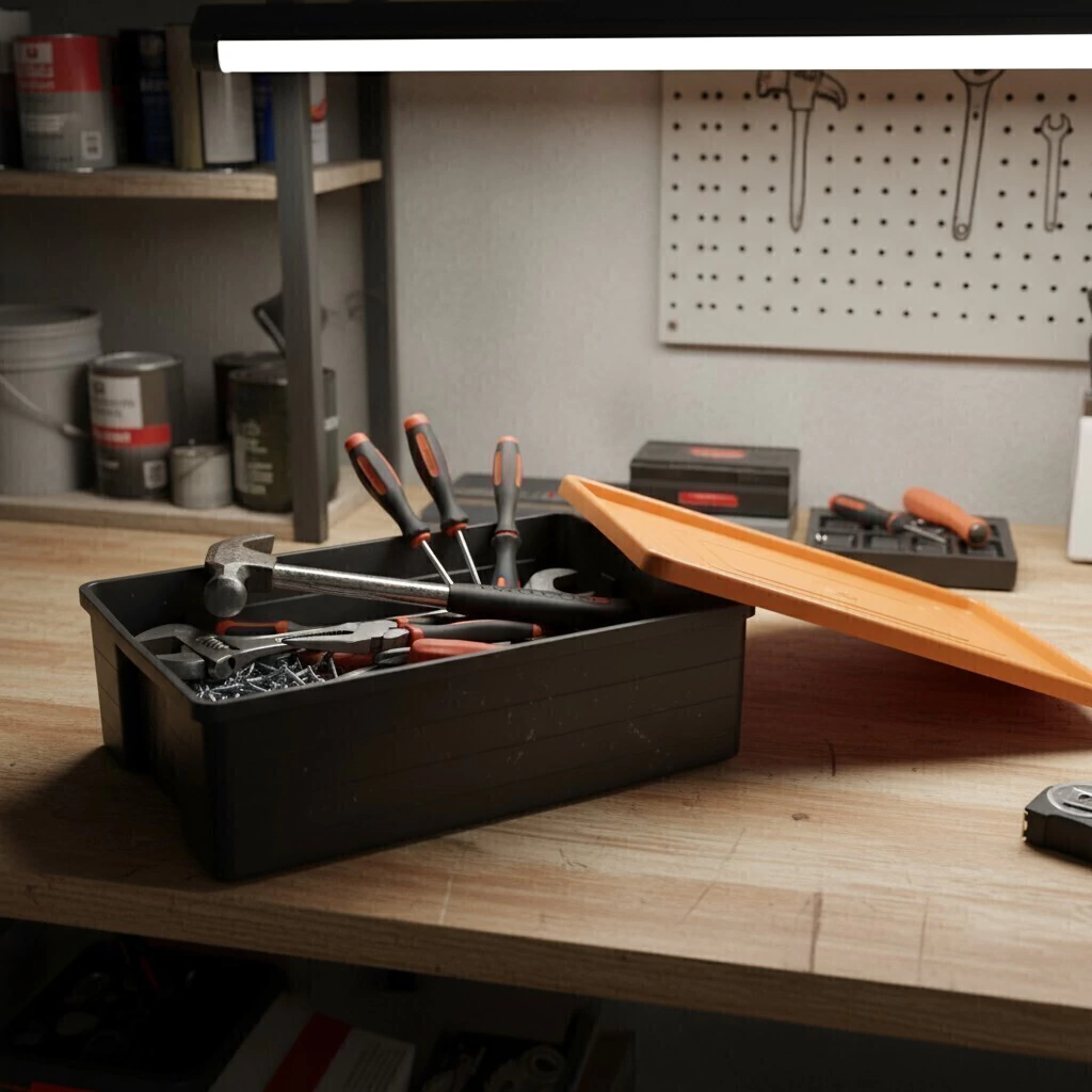 Este canasto de plástico con tapa es resistente, práctico y perfecto para uso doméstico, de taller o almacenamiento general. Su diseño robusto y tapa a presión en color naranja permite mantener el contenido protegido y ordenado.