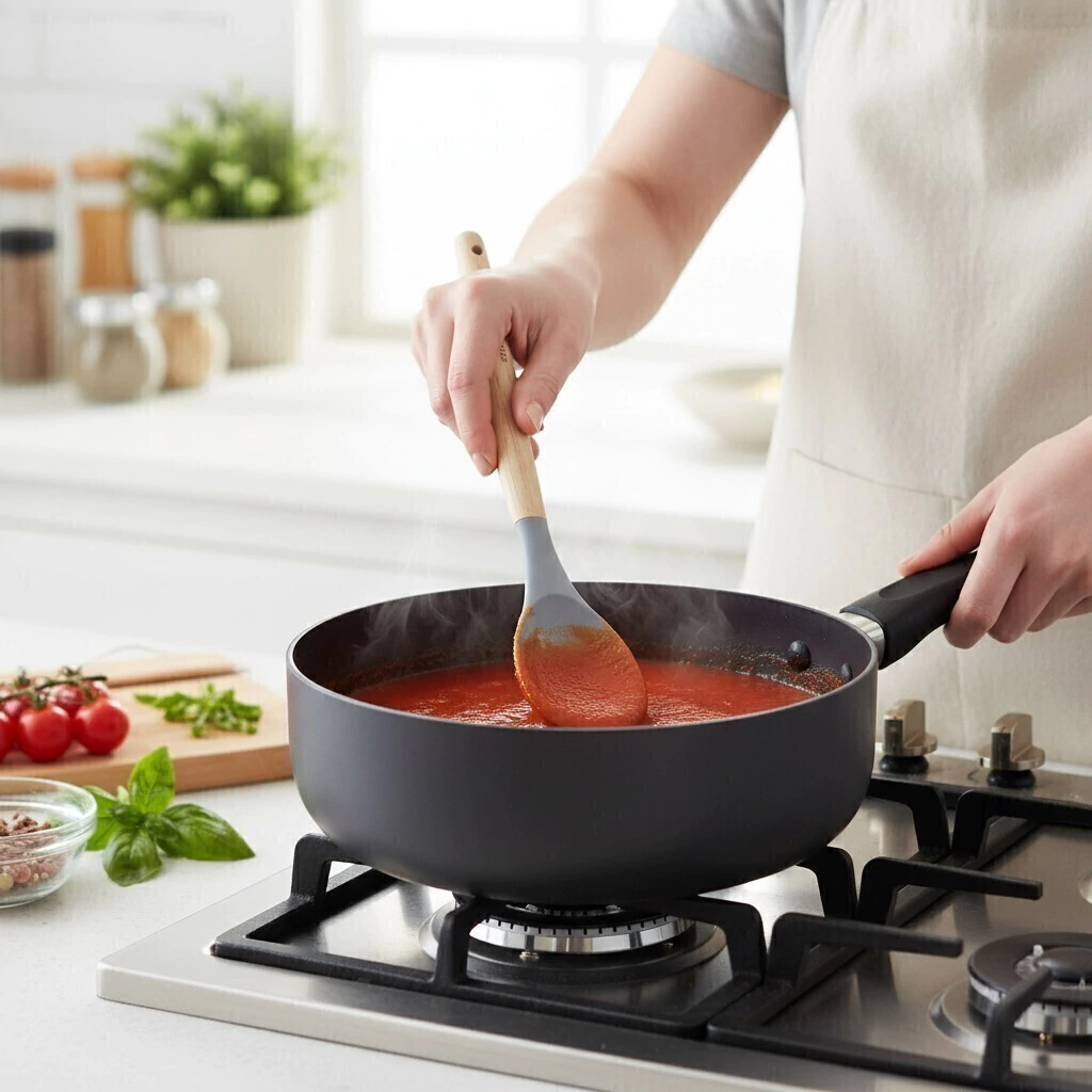 Su diseño combina materiales de calidad que protegen tus utensilios de cocina mientras te ofrecen un manejo cómodo y seguro. La silicona evita rayaduras y la madera proporciona un agarre suave y natural.