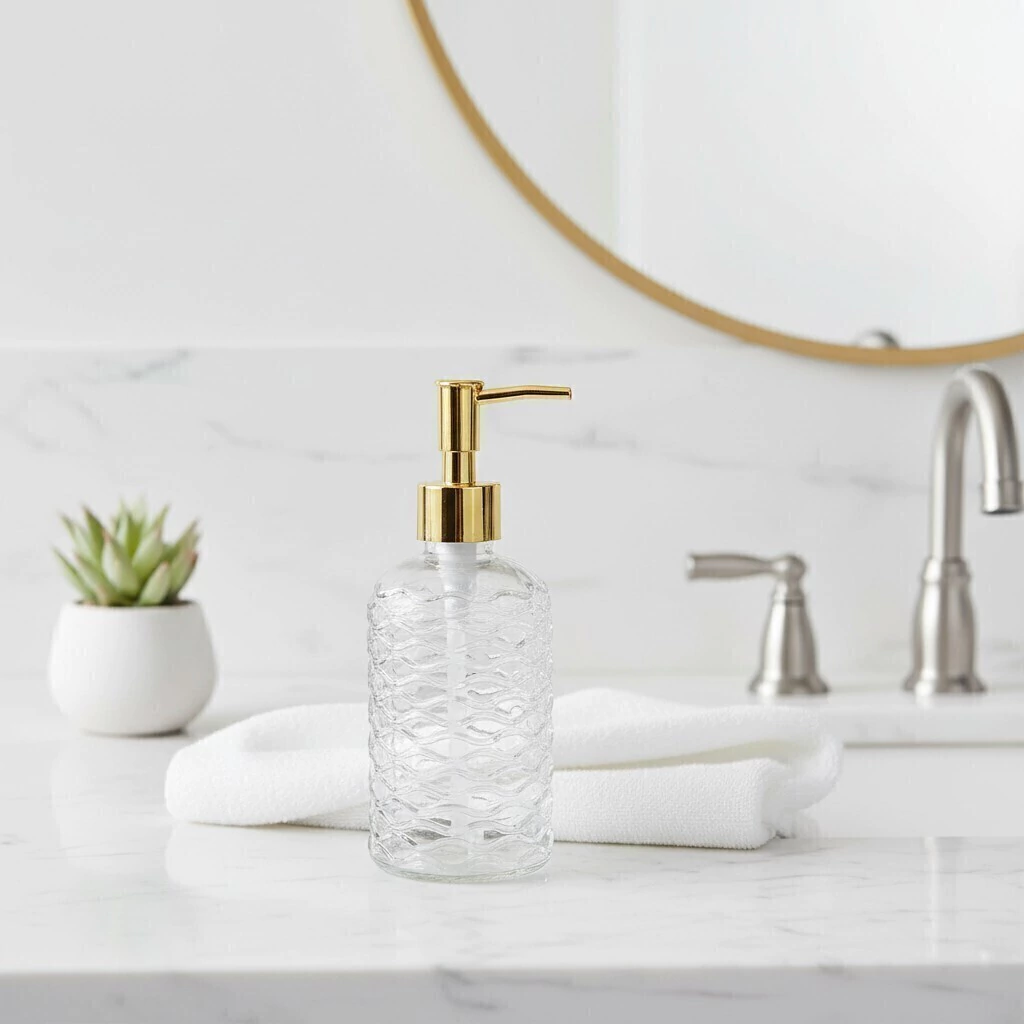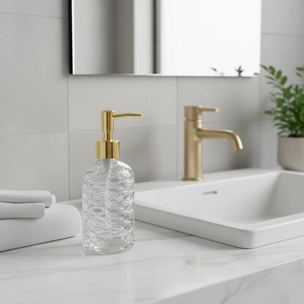 Dispenser Dosificador de Vidrio para Jabón – Diseño de Olas, Fino, Elegante y Dorado
