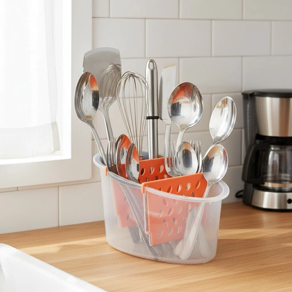 Escurre Cubierto Plástico Ovalado 3 Divisiones Optimiza el espacio y la organización en tu cocina con este práctico escurre cubiertos ovalado, diseñado especialmente para mantener ordenados tus cubiertos tras el lavado.
