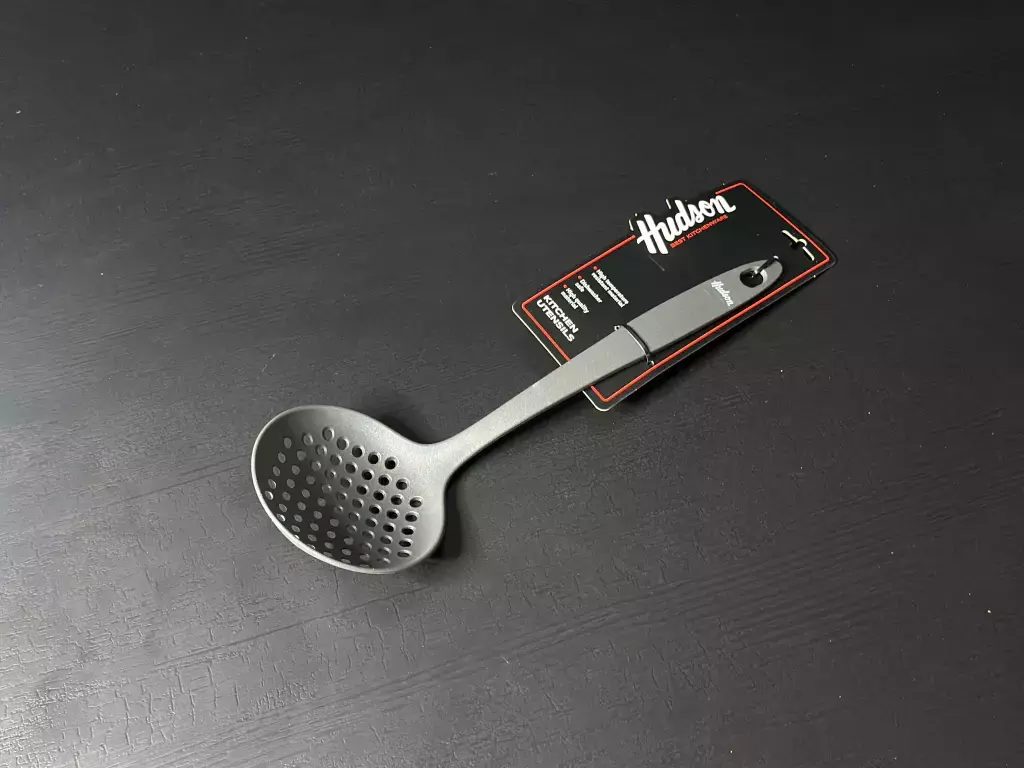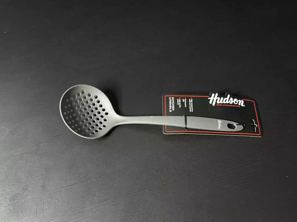 Práctica y resistente, esta espumadera de nylon antiadherente es ideal para escurrir alimentos sin rayar tus ollas, sartenes o moldes.