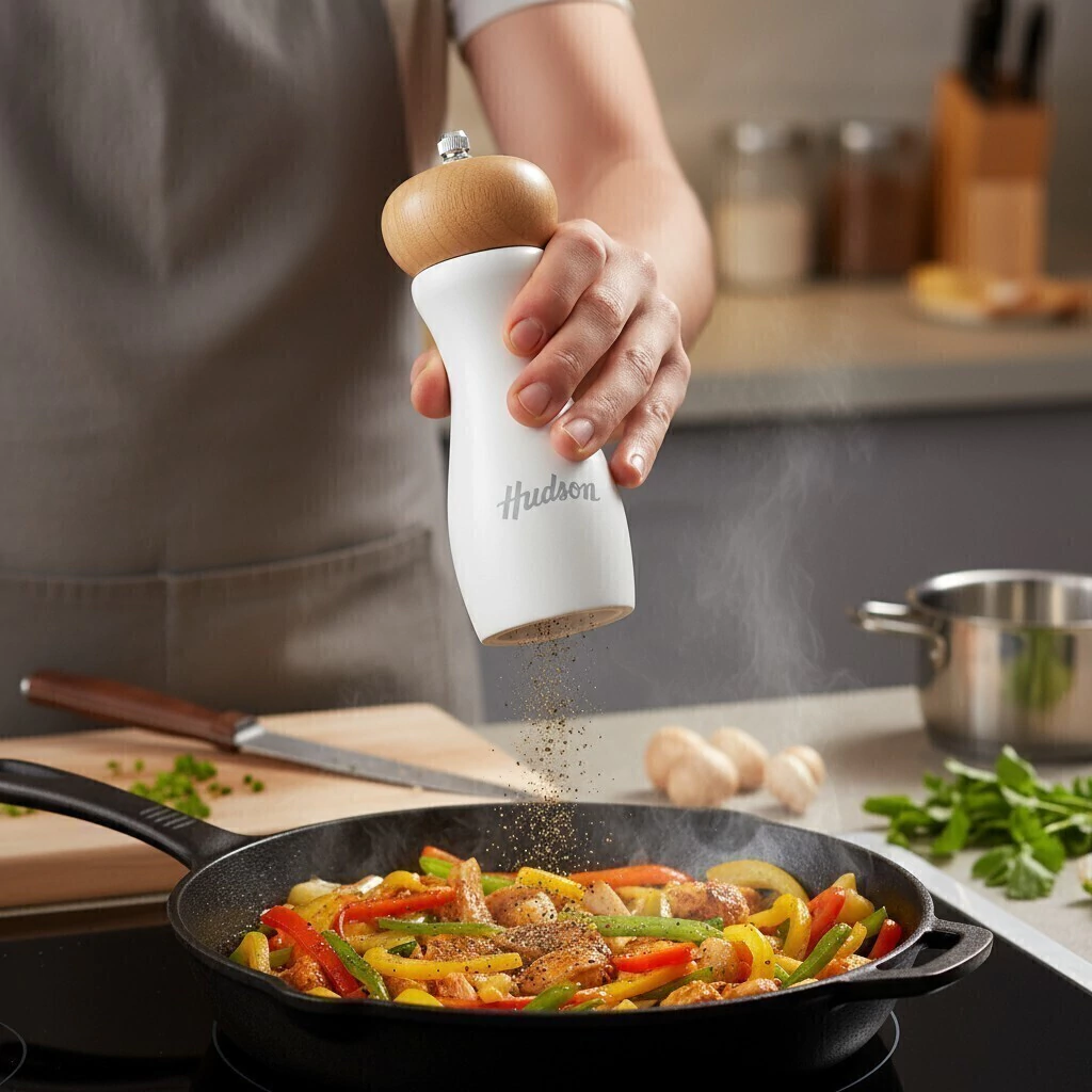 Condimentá tus comidas con estilo y precisión con el Molinillo de Madera Hudson, un accesorio elegante, práctico y duradero, ideal para cualquier cocina moderna. Su diseño laqueado en color blanco aporta un toque sofisticado tanto al momento de cocinar como al servir en la mesa.