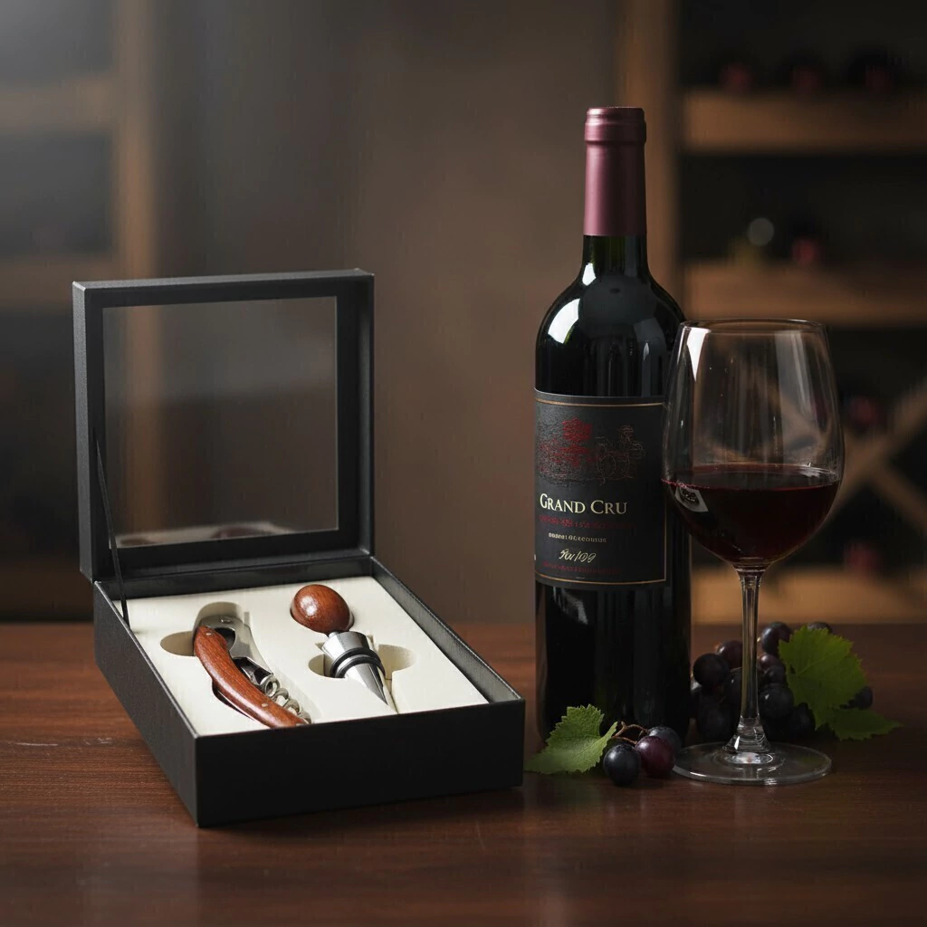 Elegante, práctico y funcional. Este set de 2 piezas para botella es el complemento ideal para tus momentos especiales o para regalar en cualquier ocasión. Incluye un destapador metálico de diseño moderno y un tapón reutilizable, ambos presentados en una cuidada caja de cartón que realza su presentación.