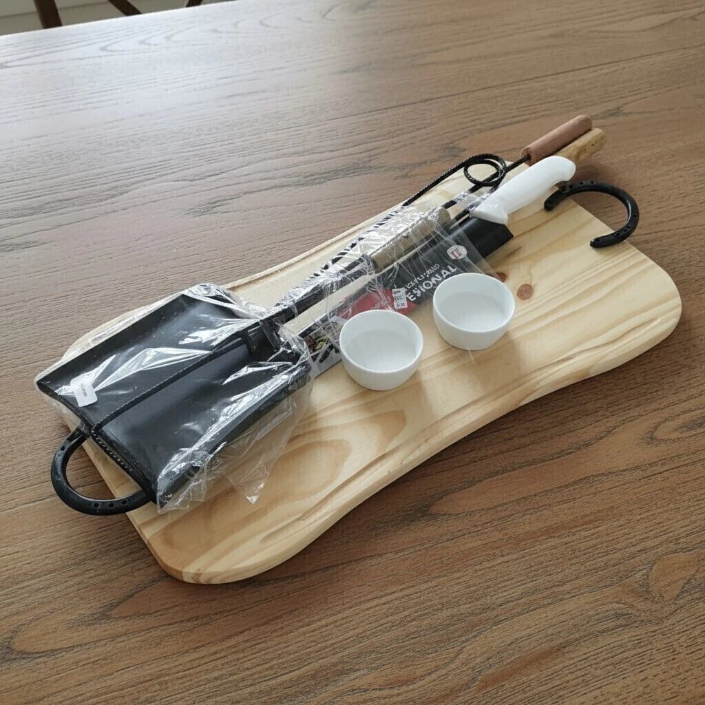 ✅ 1 Tabla de Madera – Ideal para cortar y presentar carnes, quesos o guarniciones. Resistente y con excelente terminación.